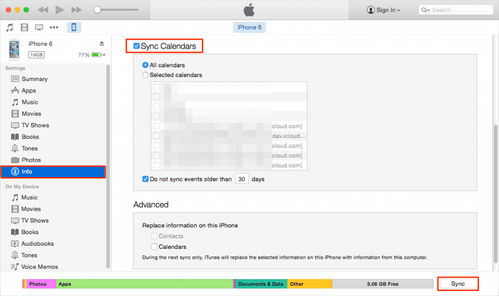 Schritt 3. Wählen Sie die zu synchronisierenden Kalender aus und wählen Sie entweder „Alle Kalender“ oder „Ausgewählte Kalender“. Klicken Sie auf „Synchronisieren“, um den iPhone-Kalender mit dem Computer zu synchronisieren.