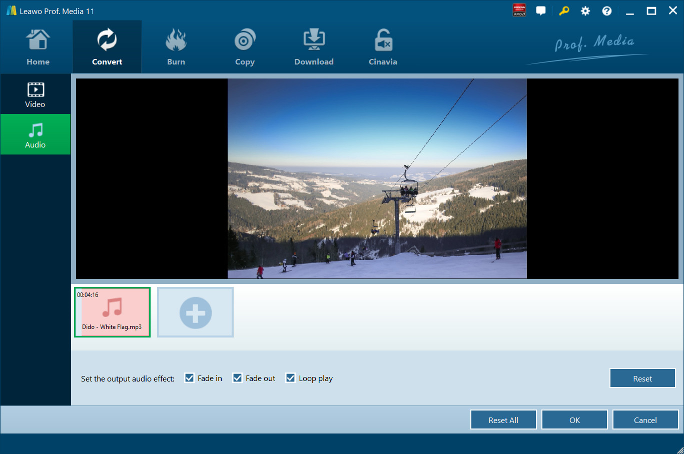Sous l'onglet Audio, vous pouvez importer de l'audio ou une chanson comme musique de fond et définir l'effet audio de sortie comme le fondu d'entrée, le fondu de sortie et la lecture en boucle.