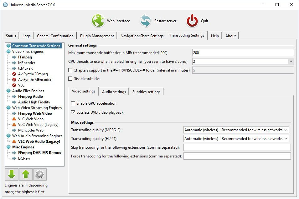 As another free Plex alternative, Universal Media Sever, also known as UMS in short, is a DLNA, UPnP and HTP/S media server, which allows you to organize your music, photos and videos on your computer and then stream them to supported devices on the same local network. It could stream media files and transcode them in real-time automatically for unlimited playback on receiving devices by using FFmpeg and MEncoder.