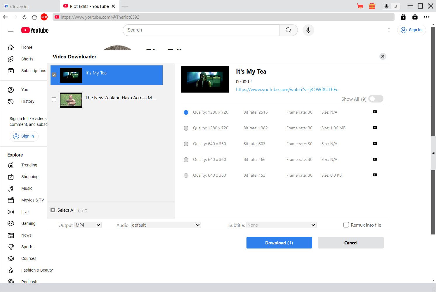 Step 4: Select and Download the Videos: Once you open your desired YouTube channel page, CleverGet will automatically detect all videos and here you can choose from all available videos or select only the individual videos that you would like to download. Also, you can choose a resolution and then click the Download button. All selected videos will start downloading on your device right away.