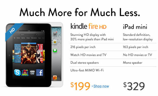 Obviously, it aims to make the consumers feel that compared with iPad mini, Kindle Fire HD has more advantages. At first, from the perspective of price, Kindle Fire HD costs much less. Second, Amazon highlights Kindle Fire HD’s advantage in speakers and Wi-Fi. And Amazon also emphasized the fact that the “stunning” display of the Kindle Fire HD has “30% more pixels” than the iPad Mini and pointed out iPad mini’s “standard definition, low-resolution” display.