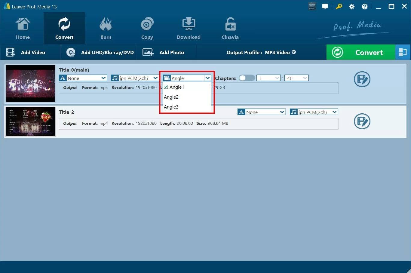 After your disc is loaded, on the convert page, you can choose the subtitles, clip angle, chapters, and others.