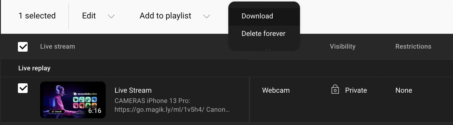 3) Find the live stream you wish to save, then select “Download” and the video will start downloading to your computer in MP4 format.
