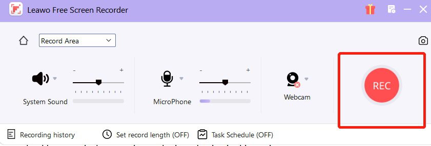 Step 2: Adjust the “System Sound”, “MicroPhone”, and “Webcam”, then click “REC” to start recording.