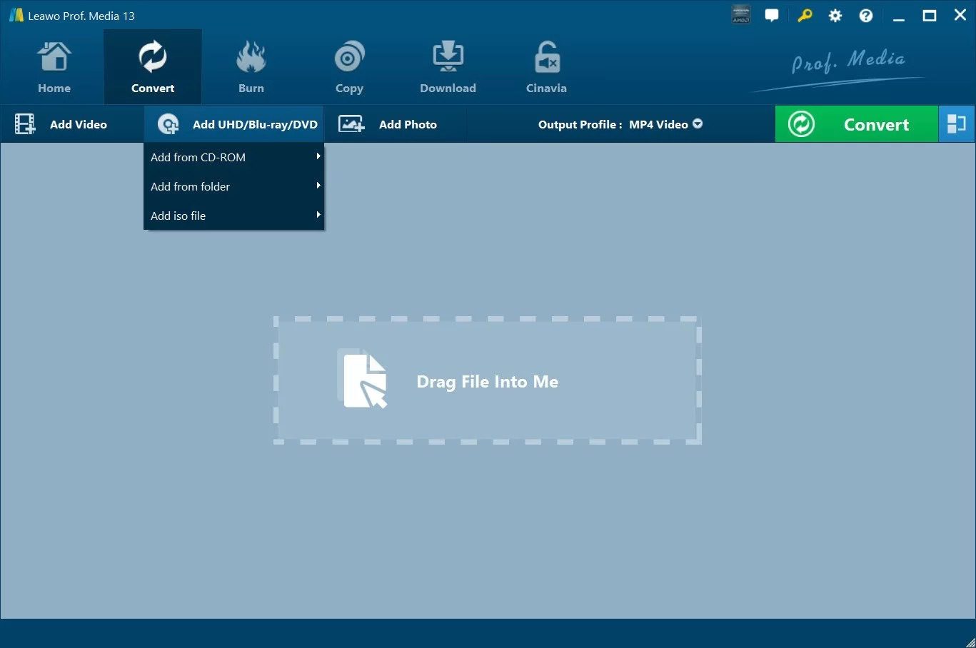 Step 1: Insert your disc and open Leawo. Click UHD/Blu-ray/DVD > Add from CD-ROM to load your disc.