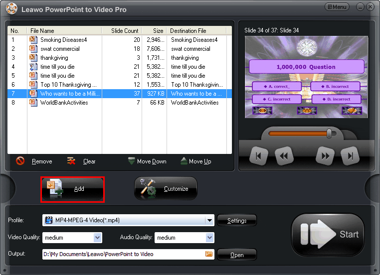 프로그램을 실행하고 "를 클릭하세요.추가"를 사용하여 PowerPoint 파일을 가져옵니다. 변환기는 PowerPoint 2003/2007/2010을 지원하며 Win 7과 호환됩니다.