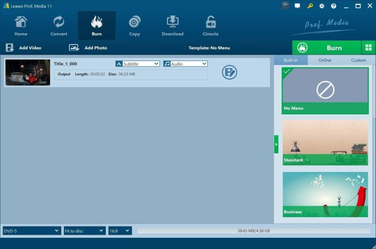 Leawo DVD Creator is er in een gratis en premium versie. De proefversie biedt rudimentaire DVD-brandmogelijkheden, hoewel er bepaalde beperkingen zijn op de functies en de uitvoerkwaliteit. Als u de kracht van menu-aanpassing, ondersteuning voor meerdere formaten en supersnel branden wilt, dan moet u zeker de volledige versie of de Prof. Media pakket.